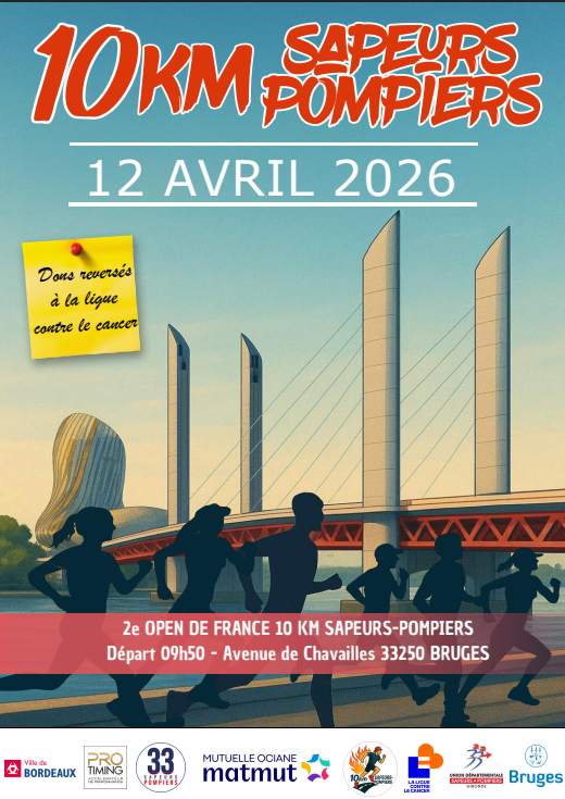- le 10 km des Sapeurs-pompiers de Bordeaux-Bruges est ouvert de la catégorie cadet (athlète né à partir de 2010) à Master, pour tout athlète licencié et non licencié de toutes nationalités. Le départ sera donné à 9h50 pour le SAS préférentiel (-35′) puis trois vagues de niveau seront mises en place (<50’/ entre 50′ et 60′ / >60′).